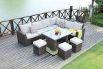 -Direct Wicker's outdoor patio furniture sets includes 2 side sofa 1 middle sofa 1 corner sofa 1 coffee table 3 ottoman.